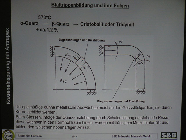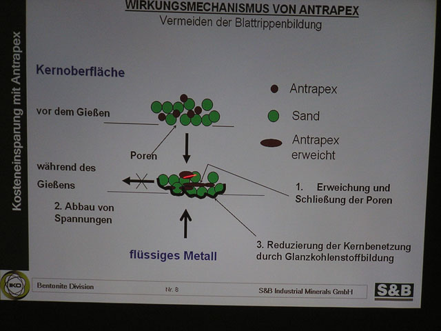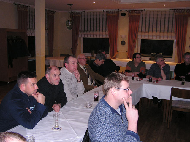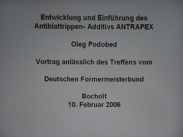 Na wer sagt denn, dass das Interesse an einem Besuch der Monatsversammlung nachlässt? Der Abwärtstrend ist hoffentlich gestoppt und es kommen wieder mehr Mitglieder zu den Versammlungen. War es das interessante Thema, dass 21 Kollegen dazu bewegte am Freitag, den 10.02.2006 um 20:00 Uhr ins Vereinslokal „Zur Glocke“ zu kommen? Der 1. Vorsitzende Willi Kobs bedankte sich bei den Kollegen für ihr Kommen und begrüßte den Vortragenden Herr Dr. Ing. Oleg Podobed von der S&B Industrial Minerals GmbH der einen Vortrag mit dem Thema: „Entwicklung und Einführung des Antiblattrippen-Additivs ANTRAPEX “ vorbereitet hatte. In diesem wurde Anhand von Graphiken, Charts und Bildern auf die Entstehung von Blattrippen und Maßnahmen zu ihrer Vermeidung eingegangen. Durch Anwendungsbeispiele verschiedener namhafter Gießereien wurde die erfolgreiche Einführung deutlich gemacht. Im Anschluss an den Vortrag beantwortete Herr Dr. Ing. Podobed die zahlreichen Fragen der Kollegen. Der Vorsitzende bedankte sich beim Vortragen für den interessanten Vortrag und Kollege Helmut Purwin überreichte ihm als Dank ein Präsent. Bevor man zum gemütlichen Teil überging, wurde auf die nächste Versammlung am 10. März hingewiesen und die Teilnehmer gebeten sich für die Bezirkstagung am 06. Mai in Köln anzumelden. Für das leibliche Wohl wurde auch wieder gesorgt. Ein Imbiss gereicht und der Vortragende übernahm die Kosten für die Getränke.